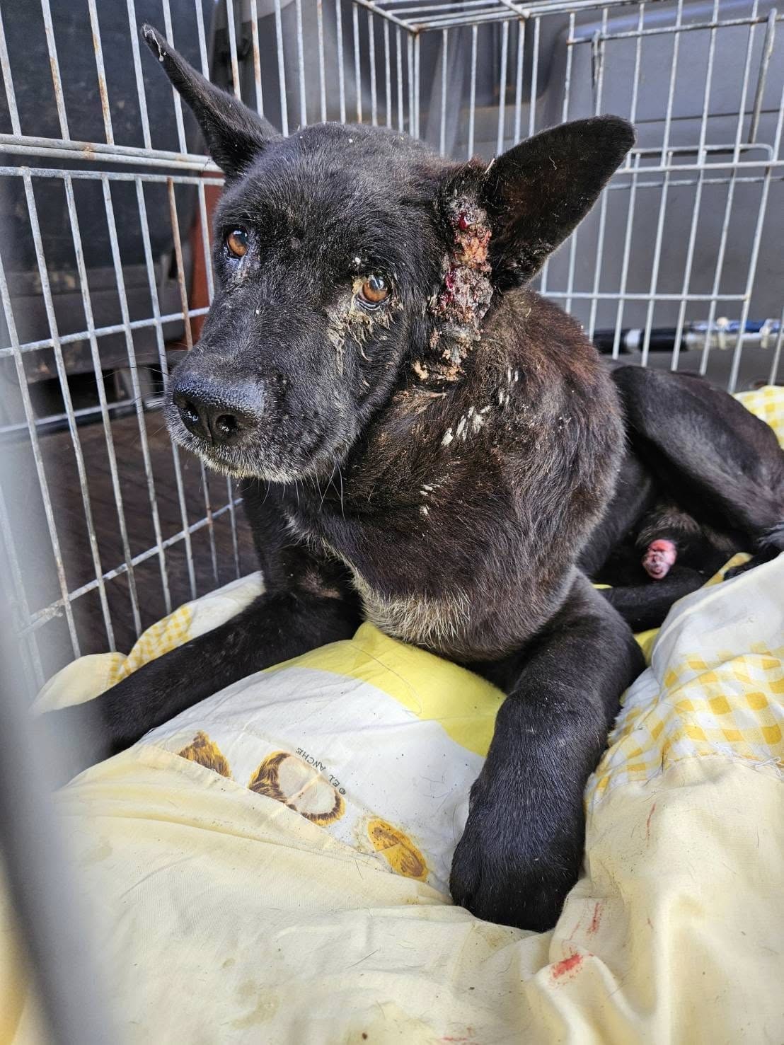 小黑的大腫瘤已經嚴重壓迫神經,導致左前腳整個腫脹行動受阻,這顆腫瘤把他的營養全吸收了,感覺腫瘤比身體還重
